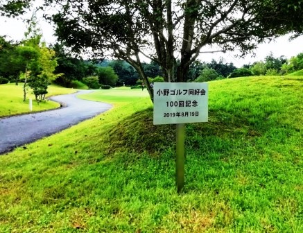 時々紹介しています。私が幹事を務めている「小野ゴルフ同好会」が100回目の大会を無事8月19日に開催できました。上の写真は比良ゴルフクラブのアウト1番の横に設置しました記念プレートです。第一回大会は2010年5月10日開催で参加19名でした。だい100回大会は参加45名でした。